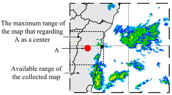 After sorting out flood data for area A, we sort out the radar echo maps surrounding area A, which are usually obtained from the weather bureau. Assuming that the radar echo maps provided by the bureau are recorded at intervals of k, we obtain radar echo map data of the surrounding x × y grid with A as the center. Assuming that the time of the first radar echo map is k1, and the interval between each image is k, then we can represent m continuous radar echo maps as PA = [pA(k1), pA(k2), …, pA(km)], where ki = ki−1 + k. The value of k usually ranges from 10 min to one hour. The kith radar echo map pA(ki) in PA can be expressed as pA(ki) = [va,ki(1, 1), va,ki(1, 2), …, va,ki(1, y), va,ki(2, 1), …, va,ki(2, y), …, va,ki(x, 1), …, va,ki(x, y)]. Note that A will not be in the center of the radar echo map when A is located at the edge of the map. In this situation, making A the center would limit the range of the radar echo map, as shown in Figure 4. Note also that the radar echo map grid is actually a rectangle, due to the limited the range of the radar echo map obtained from the government and limitations due to terrain and other factors. We must assume that the radar echo map obtained from the weather bureau is accurate and reasonable. The grid used for radar echo maps should be adjusted to the specifics of the intended application. The additional information provided by grids of high resolution can significantly increase CNN prediction accuracy, and our lightweight model based on the CNN architecture would also benefit from grid of higher resolution. Nonetheless, any improvement in accuracy would come at the cost of higher computational overhead. In other words, selecting the resolution of radar echo maps involves a trade-off between accuracy and computational capacity or efficiency. In fact, the computational demands of large-scale CNNs are likely to exceed the capacity of all but the most highly enabled computer systems.