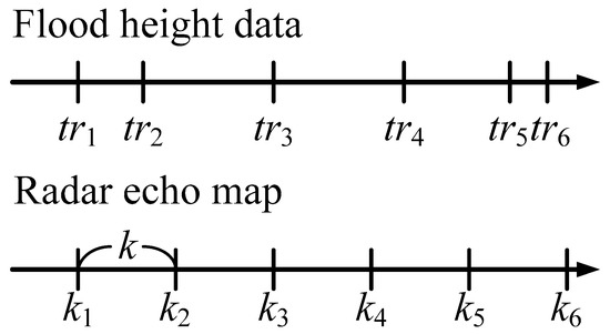 Sub-step (2) involves combining the data of flood height and the radar echo map. This sub-step is needed because the time intervals and time of the flood sensor and the radar echo map may be different. There is no direct correspondence, as shown in Figure 5. The details of this sub-step are as follows. We assume that the radar echo map data set is PA = [pA(k1), pA(k2), …, pA(km)], where k1, k2, …, km are continuous points in time, and the intervals between each point in time are k. We perform the following checks for the ith time point tri of TimeA.