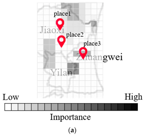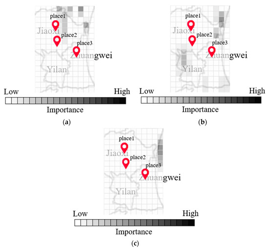 Key grid cells selected from among Grad-Cam results in Yilan area. (a) Key grid cells of place 1. (b) Key grid cells of place 2. (c) Key grid cells of place 3.