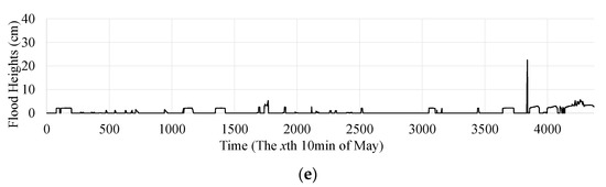The time series of flood heights in five monitoring locations. (a) Yilan place 1. (b) Yilan place 2. (c) Yilan place 3. (d) Yunlin place 1. (e) Yunlin place 2.