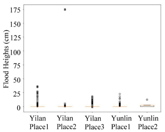To limit the amount of data requiring processing, we selected the areas and months with the most frequent flooding in Yilan and Yunlin, based on data from all water level gauges in the regions of interest. This included three points in Yilan in June 2020 and two points in Yunlin area in May 2020 (see Figure 11). Note that none of these locations are located on the seaside or riverside, thereby ensuring that the flood height would not be affected by the tides or the height of the river. These locations conform to the research limitations of this paper, which focuses exclusive on the use of radar echo maps as inputs for prediction. We also listed a time series of flood heights (Figure 12), a box and whisker diagram of flood height (Figure 13), and statistics of flood height (Table 1). Note that the units used to denote water levels in these charts match those of the water level gauges (cm). Table 1 lists the volumes of data collected for each monitoring point and the amount of data cleaned during the time period of interest. Overall, 70% of the data was used for training, 10% was used for testing, and 20% was used for validation. In addition, since the experimental data in this paper are not sufficient to divide the training, validation, and test data sets into different flooding events, we only use the method of random selection to compose these three data sets.