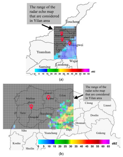 Figure 15 present the key grid cells selected from the Grad-Cam results of the three observation sites in Yilan. We can see that regardless of the observation site, all key grid cell–cell combinations included grids over the sea northeast of Yilan. This appears reasonable, based on the fact that most of the rainfall in Yilan is carried in by rain clouds from the northeast to strike the mountains to the west of Yilan (see Section 4.1). Most of these rain clouds were located over the sea to the northeast of Yilan at 30 min prior to the onset of flooding (the time difference between the input radar echo map and the output), as evidenced by the radar echo maps of the flood events in Figure 16 and Figure 17. We also examined key grid cells other than those in the northeast (see Figure 15). Due to the location of Observation Station 1 to the north of the city, the key grid cells differ from those associated with the other Yilan stations, as shown in Figure 15a. Observation Station 2 is located near the Dongshan River (largest river in Yilan), such that flooding in that area is affected by the river level as well as rainfall. Thus, it is not surprising to observe that the key grid cells were located in upstream areas of the Dongshan River and its tributaries, as shown in Figure 15b. Observation Station 3 it is located by the sea and there is no large water system around it; therefore, rainfall in other places in Yilan did not affect flood height in the vicinity of this station, with the result that no additional key grid cells were identified, as shown in Figure 15c.