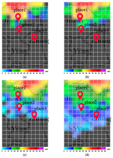 Radar echo maps of the actual flood event 1 in Yilan (26 June 2020, A.M. 04:40~05:10): (a) 04:40. (b) 04:50. (c) 05:00. (d) 05:10.