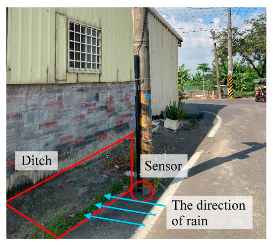 Figure 18a,b present the corresponding key grid cells selected by Grad-Cam for the monitoring stations in Yunlin. Most of the rainfall in Yunlin during May and June is caused by airflow from the southwest (see Section 4.1). Thus, flooding at Observation Station 1 should theoretically be correlated with flooding in the southwest roughly 30 min before. The key grid cell selection results in Figure 18a confirm a strong correlation between rain clouds and key grid cells located to the southwest. As mentioned in the previous section, the LDNN prediction results for Observation Station 2 were inferior to the CNN results. Figure 18b shows that the key grid cells are located to the southwest of Observation Station 2; however, the distance between Observation Station 2 and its key grid cells is greater than the distance between Observation Station 1 and its key grid cells. In this situation, LDNN was able to approximate the trends pertaining to flood height; however, the lower accuracy of the input information resulted in prediction error. In this situation, errors in key grid cell selection can partly be attributed to sensor settings at Observation Station 2. As shown in Figure 19, the sensor was placed on a slope next to a ditch, such that every time it rained (even without flooding), water flowing into the ditch passed the sensor, thereby erroneously indicating flood conditions. This kind of inaccuracy in the trained model no doubt affected Grad-Cam performance in the identification of key grid cells. Essentially, the radar echo map indicates the position of rain clouds at Observation Station 2, regardless of whether they are likely to produce heavy rainfall, with the result that the key grid cells are further south than those of Observation Station 1.