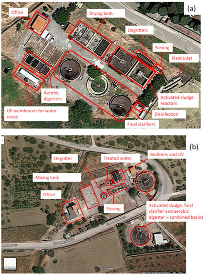 Panoramic view of the Corleone (a) and Marineo (b) WWTPs (source https://earth.google.com/web/ accessed on 20 July 2020).