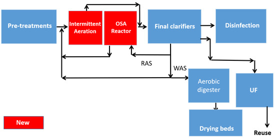 The current main wastewater treatment line is being upgraded with an anaerobic sludge reactor inserted in the activated sludge recycling line according to the oxic–settling–anoxic/anaerobic (OSA) process configuration (Figure 2). Indeed, the CAS-OSA system is a technologically simple and economically sustainable solution designed to reduce the production of waste activated sludge compared to the CAS system [18].