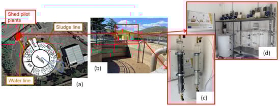Within the Wider-Uptake Project, two process lines have been set up as deviation lines from the main wastewater treatment scheme: final filters (columns) filled with biochar and zeolites for nutrient (N and P) recovery (Figure 3c) and a pilot plant for polyhydroxyalkanoate (PHA) production (Figure 3d). The goal is twofold: on the one hand, the enhancement of nutrients recovery by using two different adsorption materials (e.g., biochar and zeolites), while, on the other hand, different plant operational conditions will be investigated in order to maximize the PHA accumulation within the biomass and minimize the energy consumption and GHG emissions (both direct and indirect).