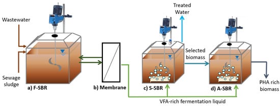 In particular, the deviation line for PHA recovery (Figure 4) is characterized by a fermenter unit for volatile fatty acid (VFA) production (namely, F-SBR), an ultrafiltration membrane for VFA-rich fermentation liquid separation, a sequencing batch reactor for the growth of the PHA-accumulating organism (namely, S-SBR) and a sequencing batch reactor for the accumulation of PHA (namely, A-SBR). The deviation line can treat around 40 L/day of the waste-activated sludge produced by the full-scale treatment line.