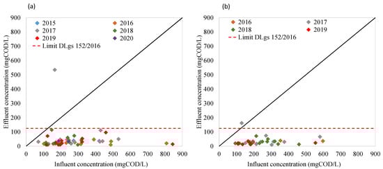 Influent and effluent COD concentration for the Corleone (a) and Marineo (b) WWTPs during the years 2015–2020.