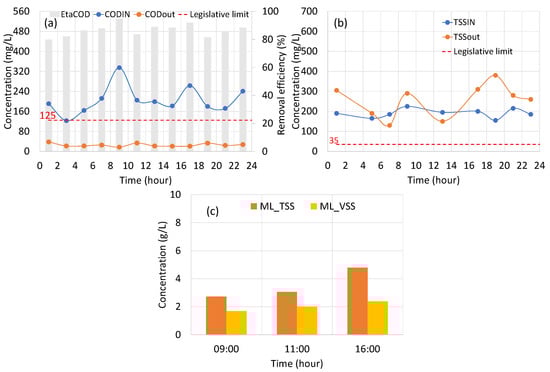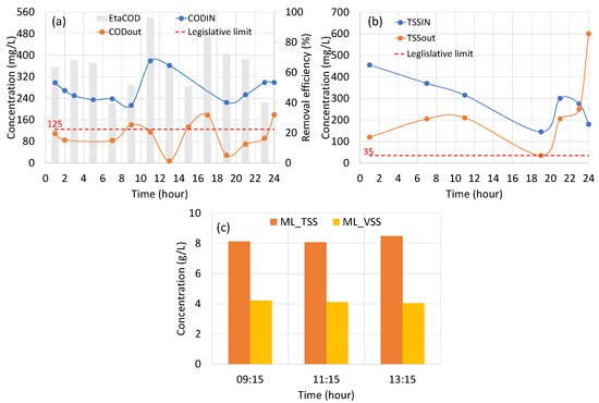 The influent COD concentration in Corleone ranged between 125 and 320 mg/L (Figure 10a). These values were quite low compared to the typical urban wastewater COD concentration [2]. This result was likely due to wastewater dilution caused by parasitic clear water infiltration. In terms of COD removal, the imposed regulatory limits were always complied by (Figure 10a). Important to precision was that, since the ultrafiltration system was yet started, here, we refer to the imposed regulatory limits for the discharge in the water body. Regarding the influent TSS, a similar dilution effect as discussed for the COD was observed. Indeed, the influent TSS concentration ranged between 130 and 380 mg/L (Figure 10b). In terms of the effluent TSS concentration, the discharge limit of 35 mg/L was always exceeded. This circumstance will be discussed in detail below. Mixed liquor TSS and VSS data are reported in Figure 10c. The achieved data showed that the TSS concentration slightly increased during the monitoring day (from 2.7 to 4.8 g/L); this result was likely due to the sludge withdrawal operations from the secondary clarifier to the sludge line. Indeed, the sludge withdrawal occurred discontinuously and only at the end of the day.