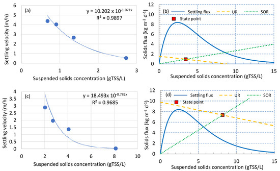 For Corleone WWTP, the settling velocity curve, calculated by diluting the MLSS samples, showed that the velocity ranges between 4.3 and 0.5 m/h for 0.8 and 2.8-gTSS/L, respectively (Figure 12a). This result is in accordance with the typical values suggested in the literature (around 4 m/h for 2.8–3-gTSS/L) [31]. However, the obtained SVI value (equal to 128 mL/gTSS) suggests that the sludge has a poor settling capability. Moreover, since, after 30-min settling, the sludge is not compact and the SSV30 is high, the presence of filaments bacteria is suggested [2]. This circumstance is likely due to the poor mixed liquor aeration caused by the old surface aeration system, since plant monitoring was performed before the aeration system replacement. The data reported in Figure 12b show that the state point is within the settling flux curve, thus suggesting that the clarifier is not overloaded. This result corroborates the fact that the high TSS effluent concentration can be due to the poor biomass settling properties and to the likely filamentous bacteria presence. The settling velocity curve calculated by diluting the MLSS for the Marineo WWTP shows that the velocity ranges between 2.89 and 0.027 m/h for 2 and 8-gTSS/L, respectively (Figure 12c). The obtained DSVI value (equal to 70-mL/gTSS) for the Marineo WWTP suggests that the sludge has good settling capability. However, the data of Figure 12d show that the state point is outside the settling flux curve, thus suggesting that the clarifier is strongly overloaded due to the high TSS concentration inside the aerobic reactor. The clarifier overloading is the reason for the high TSS effluent concentration. The increasing of sludge withdrawing from the bottom clarifier and the consequent TSS reduction within the biological reactor could improve the clarifier behavior.