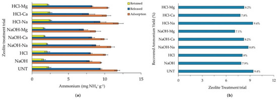 In this study, another parameter evaluated was the efficiency of the entire adsorption and desorption process, such as the percentage of NH4+ recovered from the solution compared to the NH4+ adsorbed by chemically treated zeolites. The highest efficiency was observed in treated and HCl-Na-treated clinoptilolite, the lowest in NaOH-pretreated and NaOH-Mg (Figure 13b) [29].
