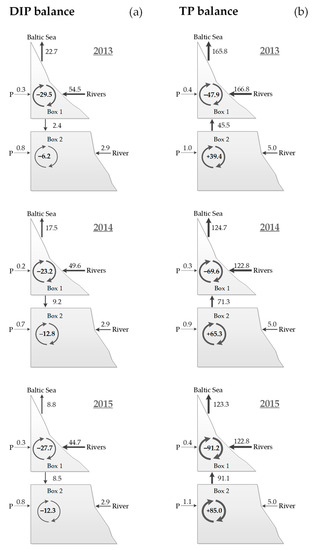 The Nemunas River always represented the main DIP input to Box 1, where DIP was retained or exported to Box 2 or to the Baltic Sea (Figure 3). Box 1 represented the main DIP input to Box 2 during 2014 and 2015, largely exceeding Deima River inputs, whereas during 2013 Box 2 received comparable DIP inputs from Box 1 and the Deima River. Area normalized mean annual DIP inputs differed by a factor of 10 in the two boxes (~200 versus 20 µmol m−2 d−1 in Box 1 and Box 2, respectively). Regardless the different inputs, on an annual basis, the two boxes were always functioning as a DIP sink, with different rates in the different areas. At Box 1, DIP retention was in the range 23–30 × 103 mol d−1 whereas at Box 2 it ranged from 6 to 13 × 103 mol d−1. Considering the large surface of Box 2, the areal removal rates resulted even more different with 60–70 and 5–10 µmol DIP m−2 d−1 removed in Box 1 and 2, respectively (Table 2). The whole lagoon retained on average 37 × 103 mol DIP d−1 in the study period, corresponding to 20–30 µmol m−2 d−1.