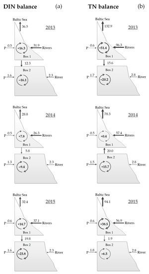 Dissolved inorganic (DIN) (a) and total nitrogen (TN) (b) balance for the Curonian Lagoon in 2013–2015. Legends are the same of Figure 3. Units are 105 mol d−1.