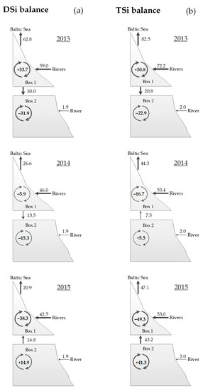 Dissolved inorganic (DSi) (a) and total silica (TSi) (b) budget for the Curonian Lagoon in 2013–2015. Legends are the same of Figure 3. Units are 105 mol d−1.