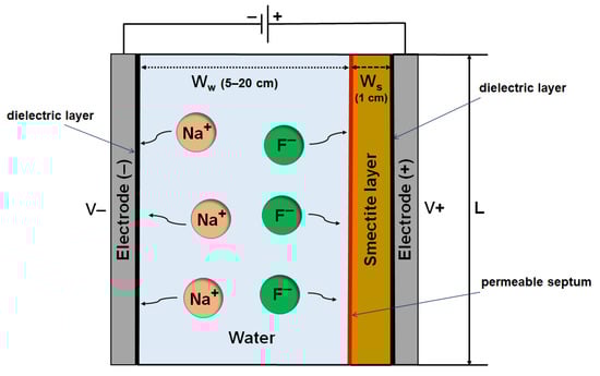 In the literature, several methods for fluoride removal from water are reported: coagulation and precipitation [15], adsorption [16], nanofiltration [17], reverse osmosis [18], membrane-based [19], electrodialysis [20], and crystallization [21]. Among these methods, with regard to defluoridation for obtaining drinking water, adsorption is one of the most suitable due to its low operational costs, relative ease of use, and its capacity to produce water of an excellent quality since it does not contaminate it with other undesirable components or generating sludges [22]. Several adsorbents have been tested for water defluoridation. These include graphene and carbon-based materials [23,24], modified alumina [25,26], porous MgO nanostructures [27], zeolites [28,29], Ce–Zn ceramic oxides [30], and even bio-based materials [31,32]. However, the combination of adsorption methods and physical fluoride removal strategies based on static electric fields has been poorly investigated. This work deals with the in silico investigation of a novel solution to impoverish fluoride-rich thermal waters. The proposed system allows modulating the various depletion stages, which could vary with varying conditions, in order to obtain the maximum efficiency in the removal of fluoride. In this paper, we describe a theoretical model for the removal of fluorine, coupling an electric field and adsorption on smectite clay to demonstrate the synergy between them. Furthermore, the designed system is modular, allowing a specific amount of water to be treated depending on the needs of a single rural community.