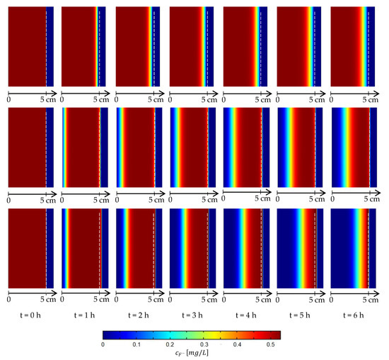 To understand the device working principles by some examples, in Figure 2 the fluoride concentration () profile along the system width for different times and applied voltages is reported. As can be seen from the first row of Figure 2, where the case of no applied voltage is presented, the only diffusion makes the ions move very slowly towards the mineral layer and the changes in the profile are only due to adsorption. On the other side, looking at the second and the third rows of Figure 2, it is possible to observe, from the representation of the profile, that, applying raising voltages, the migration process is quicker and there is a faster decrease of in the water.
