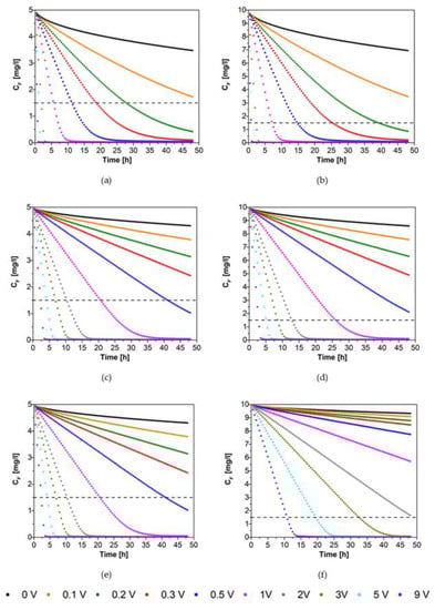 Fluoride concentration (mg/L) in the system as a function of time (t) for ww = 5 cm and cn0 = 10 mg/L and applied voltage of 0 V (first row), 0.5 V (second row), and 1 V (third row).