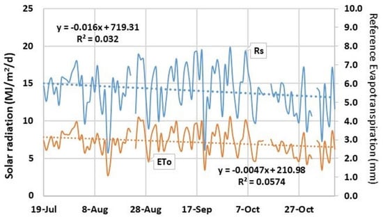Another parameter, solar radiation, also showed a slightly decreasing trend, as depicted in Figure 3. The reference evapotranspiration is also presented in the figure. At the beginning of the growing season, solar radiation reached around 15 MJ/m2/d with reference evapotranspiration of 3 mm. Then, the reference evapotranspiration and solar radiation fluctuated; however, the trend was similar to other weather parameters. The gradient of the linear equation was low (<0.01), which represented no significance in raising and decreasing those parameters. At the end of the season, the value of solar radiation was around 14 MJ/m2/d with reference evapotranspiration being lower than 3 mm. The maximum, average and minimum values of solar radiation were 19.9, 14.1 and 5.9 MJ/m2/d, respectively. At the same time, the reference evapotranspiration values were 1.1, 2.9, and 4.2 mm for minimum, average and maximum, respectively.