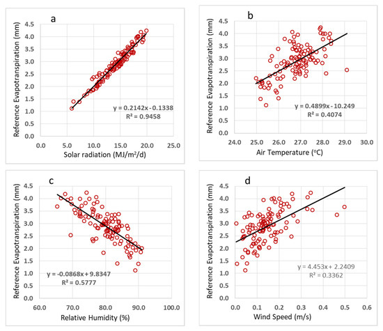 The linear relationship between the reference evapotranspiration and the weather parameters is presented in Figure 4. Among the four parameters, solar radiation has the most substantial relationship to the reference evapotranspiration, represented by the highest R2 value. The value of R2 was close to 0.95, indicating that solar radiation has the highest contribution to the variability of evapotranspiration. The second parameter that has a major influence on the reference evapotranspiration was relative humidity, followed by the air temperature and the wind speed. This relationship indicated that solar radiation most influences the evapotranspiration process through the soil surface and plants [31]. Based on the sensitivity analysis study, solar radiation is the most sensitive parameter to changes in evapotranspiration [32].