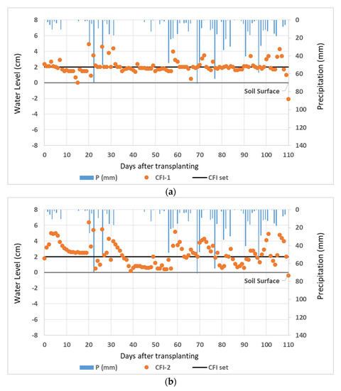 The actual condition of the water levels in the CFI regime for replications 1 and 2 (CFI-1 and CFI-2) are presented in Figure 5. In this regime, inundation with a water level of 2 cm above the soil surface was used as the set point. The water level fluctuated and was close to the set point; however, high fluctuation occurred when there was a high rain intensity event. There was a significant increase in water level, especially at 20 DAT, both in CFI-1 and CFI-2. Heavy rainfall of 26.2 cm caused an increase in water level from 1.5 cm to 4.9 cm in CFI-1 and from 2.5 cm to 6.4 cm in CFI-2. The same situation occurred at 26 DAT when 50.2 mm of rainfall contributed to raising in water level from 2 cm to 4.6 cm of CFI-1 and 1 cm to 5.5 cm of CFI-2.
