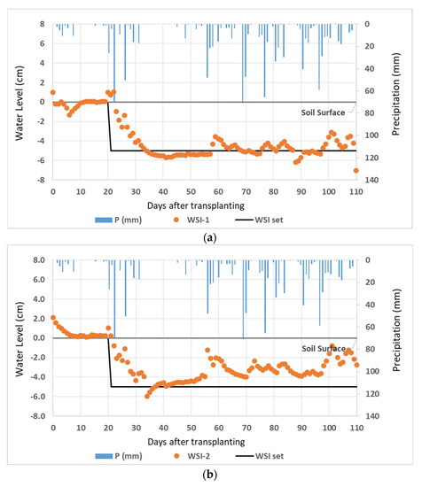As previously mentioned, there were two setpoints in the WSI regime, i.e., 0 cm at 0–20 DAT and −5 cm afterward. As presented in Figure 7, the water level in both the first replication (WSI-1) and second replication (WSI-2) was well controlled at 0–20 DAT with the first set point. There were no significant fluctuations, and the water levels were close to the setpoint even though there was low rain intensity. The average water level in this phase is −0.1 and 0.5 cm for WSI-1 and WSI-2, respectively. Then, high fluctuation occurred when the water level was dropped to −5 cm. In this period, as per the same situation in two other regimes, high rainfall events occurred. The average water levels in the stage were −4.6 cm and −3.3 cm for WSI-1 and WSI-2, respectively. These results indicated that the performance of WSI was slightly accurate, and both plots can be conditioned to be drier than the other two regimes.