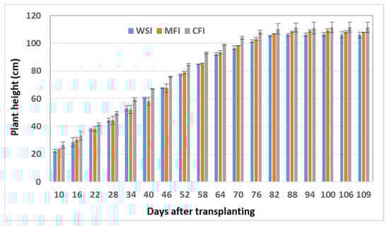 Plant height during one growing season in the three regimes is presented in Figure 8. At 10 DAT, the average plant height of the CFI, MFI, and WSI regimes was 26.5 cm, 23.4 cm, and 22.3 cm, respectively. The higher plant height of the CFI regime showed that standing water in the initial growth stage stimulated the crop to grow taller. At the beginning of the mid-season stage (64 DAT), there was a proportional and consistent increase in plant height of 98.8 cm under the CFI regime, while in the MFI and WSI regimes they were, consecutively, 93.4 cm and 92.2 cm. Finally, the highest average plant height at the end of the season was found in the CFI regime. It was 3.2% and 4.8% higher than those of the MFI and WSI regimes, respectively.