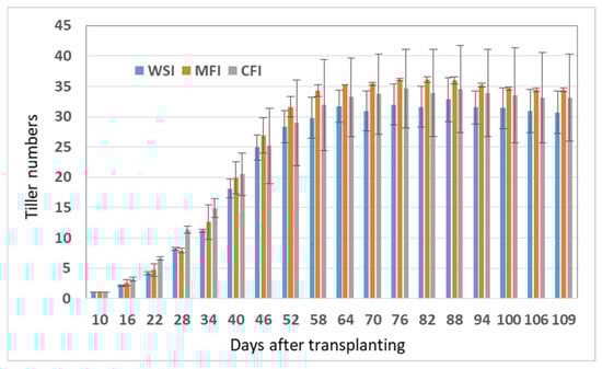 Comparable results in the number of tillers were found among the regimes, particularly in the early growth stage. At 10 DAT, the regimes produced the same number of tillers (Figure 9). A significant increase in the number of tillers occurred from the vegetative growth stage (25–30 DAT). In this phase, the number of tillers was 11, 8, and 8 in the CFI, MFI, and WSI regimes, respectively. The tiller formation ended at 70 DAT in the generative state, in which the paddies focused on grain filling. An appealing occurrence happened at the end of the late-season stage, where the MFI regime produced more tillers than the two other regimes. The number of tillers in the MFI regime was 34. It was 3.8% and 10.8% greater than the CFI and WSI regimes, respectively. Thus, saturated soil conditions (water level at soil the soil surface) were more effective in tillers formation.
