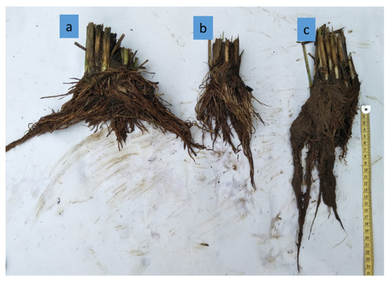 Root development of randomized hill of paddy in each regime: (a) CFI; (b) MFI; (c) WSI.