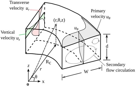 19] with various curvatures. Furthermore, curved channel flows are characterized by a secondary flow in the form of a pair of counter-rotating vortices. The primary flow is driven by a pressure gradient between the in- and outflows. The centrifugal force generates the secondary flows, the friction on the channel bottom, and the centripetal pressure gradient terms.