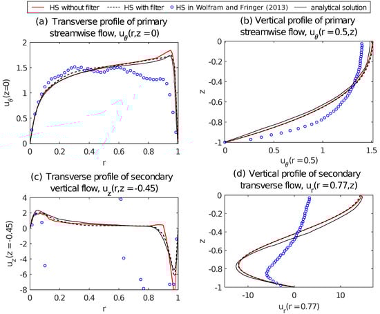 2]. Note that four flow profiles are close to the analytical results for calculations with filter scheme, as shown in