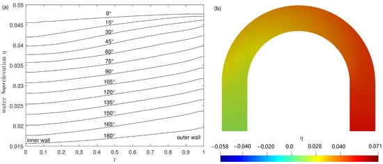 Figure 9a displays the transverse surface elevation across different channel sections. It can be seen that superelevation is mainly distributed at the outer bank, and the depression is near the inner bank, as expected. The water superelevation at