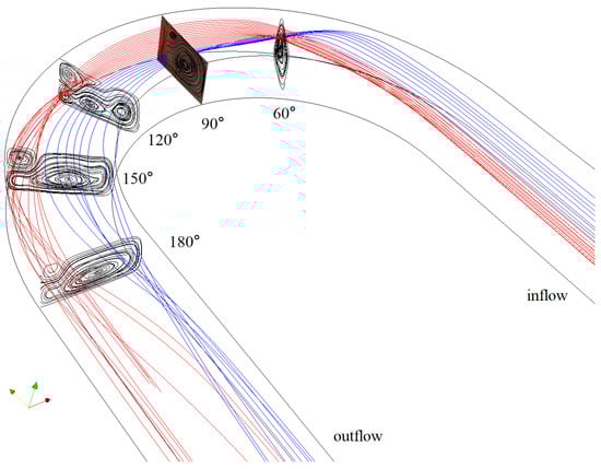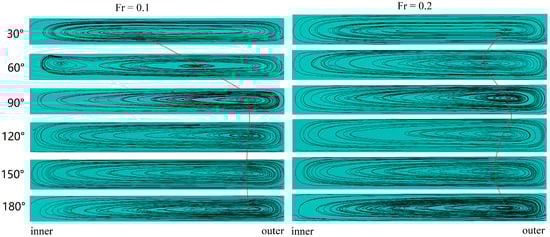 12]. For the velocity field, the streamlines change at different cross-sections of the curved channel, and their behavior is directly related to the Froude number. The streamline centers keep the same track when
