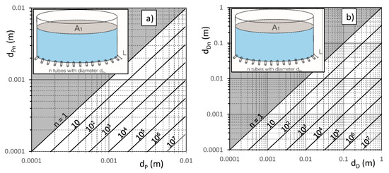 For example, in the Poiseuille reservoir, n = 104 tubes with diameter dPn = 0.0001 m discharge as one tube with diameter dP = 0.001 m. In the Darcy reservoir, n = 102 tubes with diameter dDn = 0.0001 m discharge as one tube with diameter dP = 0.001 m.