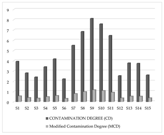 Following are the proposed MCD classes: MCD < 1.5 indicates a significantly low degree of contamination; 1.5 ≤ MCD < 2 designates a low degree of contamination in the sediment; a moderate degree of contamination occurs when MCD levels fall between 2 ≤ MCD < 4; a high degree of contamination is evident in soil when MCD levels rise as high as 4 ≤ MCD < 8; MCD values of an even higher range, 8 ≤ MCD < 16, indicate a very high degree of contamination in the sediment; 16 ≤ MCD < 32 indicates an extremely high degree of contamination in the sediment; and finally, an ultra-high degree of contamination is indicated by MCD levels in the range of ≤32 [39]. In the present study, the MCD values of all sample stations MCD are below 1.5, which indicates a nil-to-very-low degree of contamination. The MCD values are shown in Figure 3.