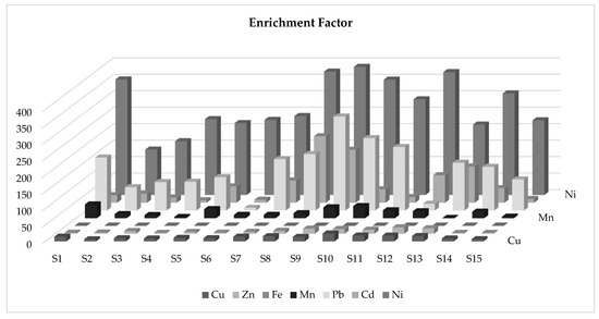 where (Me/Fe) sample is the ratio of subjected metal and Fe of the sediment from sampling location, and, on the other hand, (Me/Fe) background denotes the environmental background value of the metal–Fe ratio. Values of metal concentrations of surface world rocks were chosen as reference, owing to the lack of background values of pre-industrial times [27]. Iron was elected as the suitable element for normalization between the two sets of values from both the metal–Fe ratio of the sample and backgrounds used previously by [36,42]. Enrichment factor is graded in five classes: EF values less than 2 indicate deficiency to minimum enrichment; moderate enrichment is expressed by EF ranging from 2 ≤ EF < 5; values ranging from 5 ≤ EF < 20 indicate significant enrichment; metal enrichment is very high when EF values fall between 20 ≤ EF < 40; and lastly, EF ≥ 40 indicates extremely high enrichment. Heavy metals in River Surma posed following metal enrichment trend shown in Figure 4.