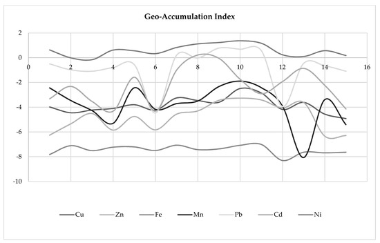 where Cm Sample is the concentration of a particular element in the sample, and Cm Background is the geochemical background value of the metal. The values from world rock surface averages given by [27] are used as reference background value [36]. Geo-accumulation index produces results in seven classes of purity. These classes are portrayed in Table 4. From the achieved results, it is evident that for most of the sites and metals, the Igeo values remained below 0, depicting uncontaminated sediments, whereas nickel (Ni) and cadmium (Pb) showed some deviance from the trend and fall in class 1. Geo-accumulation Index values of the heavy metals in river sediment are shown in the following Table 4. Figure 6 shows the variability of the Igeo values for the metal concentrations in the sediment.