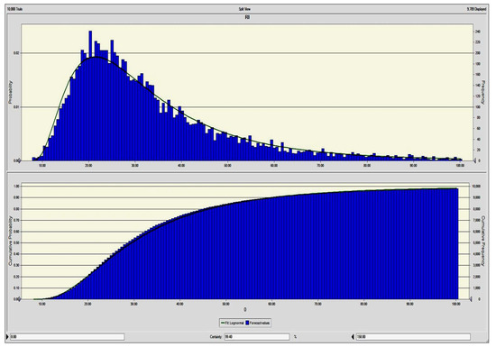 Generally, Monte Carlo Simulation is performed to elucidate the uncertainty issue, which is intrinsic to the calculation of potential ecological risk using absolute point values of metal concentration. In this method, a suitable dataset is developed, which agrees with a particular probability distribution [50]. The elemental concentrations of the river sediment acted as the primary dataset for finding apposite probability distribution and simulation of RI. According to the Kolmogorov–Smirnov test, the most suitable fitting was demonstrated by the log-normal probability distribution function, whereas other notable density functions with poor fitting included log-logistic, BetaPERT, Weibull, gamma, max-extreme density functions. Ten-thousand Monte Carlo iterations were carried out employing the software CrystalBall (Oracle Corporation, Santa Clara, CA, USA). Repeated calculation produced probability distribution for the Hakanson Risk Index. The output distribution for RI followed a log-normal distribution.