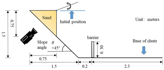 Figure 2 shows that the setup of the numerical model corresponds to the flume model reported in Part I of the study used in this calibration. The sliding surface is inclined at a fixed angle of 45° and has dimensions (length × width × height) of 4000 mm × 400 mm × 1500 mm. A hopper stores sliding sand behind an automatic gate. A barrier with a height of 300 mm is set at a distance of 0.2 m from the foot of the slope. The flume and barrier are, respectively, modeled as rigid and elastic walls as the SPH model is calibrated. The bulk density of the test sand is 1400 kg/m3. The cohesion and friction angle of the sand are, respectively, c = 0 Pa and φ = 34° in the test. The different barrier materials, namely low-density polyethylene, high-density polyethylene, and polypropylene, are, respectively, simulated with elastic moduli of 0.6, 0.8, and 1.0 GPa. Additionally, tests are conducted and the results analyzed to reveal fundamental insights into the impact dynamics of the sand flow for the three cases of barrier stiffness. In addition to ensuring computational efficiency, the test sand and flume are discretized with an initial distance of △r = 0.01 m [,]. The key simulation parameters are summarized in Table 1. The hydrodynamic equation F = αρv2hL [] shows that a change in flow velocity affects the impact force, which might result in a different load attenuation for a deformable barrier with different stiffness. To explore the effects of the frontal velocity of the debris flow, we design a systematical program for the parametric study, which is a function of barrier stiffness and flow velocity (changed by different initial position) as presented in Table 2. Among them, the initial conditions of P_15/S_6, P_15/S_8 and P_15/S_10 were corresponding to that of the experiments conducted in part I [] (S_6, S_8 and S_10, respectively).