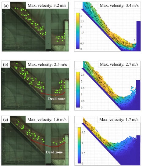 Comparison of impact kinematics at different times (test ID: P_15/S_10): (a) t = 0.00 s, (b) t = 0.11 s, (c) t = 0.50 s; the velocity field of flows through PIV (left); computed flow kinematics through SPH (right).