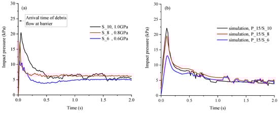 Besides comparing the flow kinematics, the impact dynamics need to be validated for the SPH model. Figure 4a,b show the evolution of the impact forces in the physical flume experiment and numerical simulation for three values of barrier stiffness. The peak impact forces obtained for the barrier were 11.7, 17.3, and 20.4 kPa in the physical experiment and 13.1, 19.5, and 22.1 kPa in simulation for E = 0.6, 0.8, and 1.0 GPa, respectively; i.e., the numerical impact forces were 12%, 12%, and 8% higher than the measurements in the physical experiment. No difference between the physical and numerical impact forces was greater than 12%, demonstrating the alignment between the results of the physical experiment and numerical simulation. The general trends of the change in the strain acting on the barrier at different values of stiffness were well simulated using the proposed SPH method. Additionally, the proposed SPH numerical framework allows for the accurate estimation of the dynamic impact process for the flow–structure interaction if used with an appropriate constitutive model.