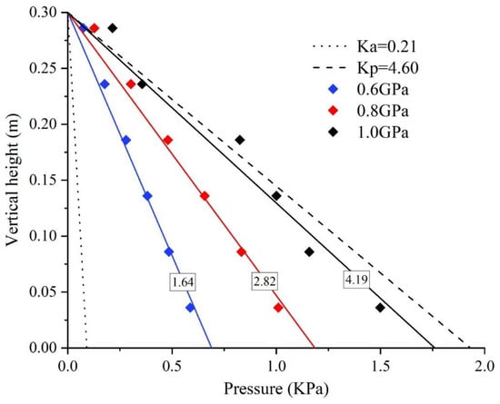 As barriers tend to deform in a downstream direction upon loading, the pressure coefficient of the granular material is expected to be close to the active pressure coefficient (Ka). For test P_15/S_10, the back-calculated earth pressure coefficient is 4.19, which is close to the passive pressure coefficient, implying a slight deflection downstream upon loading and the sand flow not being fully mobilized to an active mode. The deduced earth pressure coefficients of tests P_15/S_8 and P_15/S_6 were 2.82 and 1.64, respectively. The deflection of the barrier downstream upon loading increased with decreasing barrier stiffness. The sand flow deposited near the wall moved further with the deformation of the barrier, which in turn incrementally increased the shear energy dissipation of sand layers and shifted the deposited sand toward an active failure mode. These results show that a lower static earth pressure acts on a barrier of lower stiffness, with the earth pressure coefficient being strongly affected by the stiffness of the barrier. Additionally, the distribution of the lateral earth pressure did not reach the passive failure mode for any barrier, implying that the adoption of the passive pressure coefficient (Kp) is suitable for engineering design.