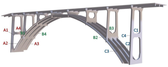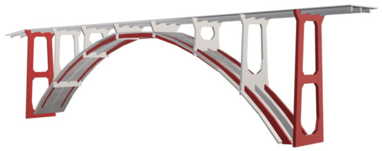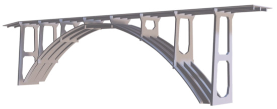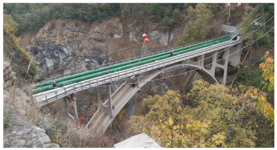 The bridge on which the experimentation was performed lies over the Dora di Rhêmes river canyon, in the municipality of Introd (AO), Italy. The infrastructure, a reinforced concrete arch bridge schematized in Figure 2, was built at the beginning of the 1920s to sustain two forced penstocks that convey the water from the water intake placed at 1155 m of altitude to the hydroelectric power plant “Champagne I” with a drop of 488 m. The bridge is not open to the public and can be reached only through a tunnel of about 240 m long across the mountain.