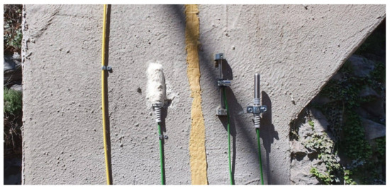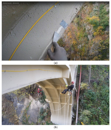 The installation procedure consisted of the following phases: (i) the concrete surface, in correspondence of the D-FOS tight cable position, is milled to eliminate the superficial cementitious mortar and favor the bond of the cable with the structure; (ii) the D-FOS strain cable is positioned on the bonding site and temporally fixed with tape every 30 cm; (iii) the adhesive is applied on the D-FOS cable and then smeared with a customized putty knife; (iv) after the hardening in a few minutes, the tape can be removed and the installation proceeds to the next section. This procedure was performed for all the approximately 400 m of D-FOS strain cable installed on the bridge by a well-trained climbing team (Figure 4).