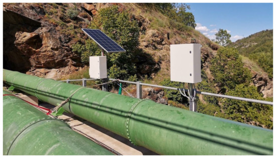 Raw data collected by VW extensometers, temperature probes and accelerometers systems are wirelessly transmitted through a solar-powered LoRaWAN gateway with a data reception and transmission unit. This device, using LTE connectivity, sends data to an online server. The system has been designed to guarantee power supply during winter when the bridge is sunlit for only 3–4 h a day. All the sensors and devices concerning VW extensometers, temperature probes and MEMS accelerometers systems were provided by Geomax S.r.l. (Milan, Italy).