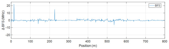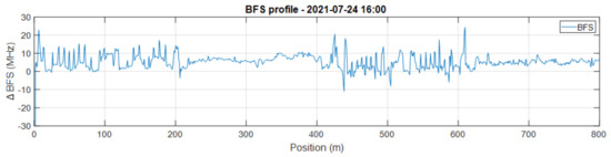 The results refer to an observation period of about two months. Figure 9 shows an example of a BFS single profile detected at a generic time. The D-FOS loops, connected in series, can be distinguished: the sharper parts correspond with the strain cable (tight), whereas the flatter ones are produced by the temperature cables (loose).