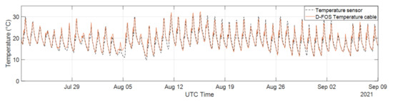 Comparison between temperature profiles at a known position: the black dashed line refers to the temperature sensor totally covered by the polyurethane adhesive whereas the orange one is the trend determined by the D-FOS temperature cable.
