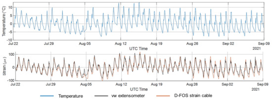 Figure 12 shows the comparison between the VW extensometer and D-FOS strain at site A1. To better understand the results, the temperature variation profile detected by the D-FOS temperature cable at the same position is also reported. The reference status, both for strain and temperature measurements, is taken on 24 July 2021 at 00:00. From the graph we can observe that the temperature variation and strain profiles have a strong positive correlation coefficient: if we consider VW extensometer is 0.90, whereas with DFOS is 0.88. The residual lack of agreement is probably due to the non-linearity generated by the geometrical and static complexity of the structure. Further investigations will be possible once a broader dataset is collected.