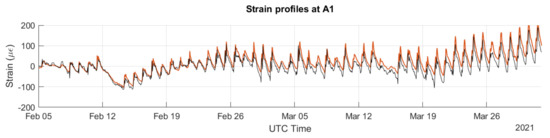 The measured strain range for the considered time interval is about ±100 με, compatible with the assumption of sensing only thermal stresses and with the thermal seasonal regime of the period taken into account. The matching between the two strain series is also quite good, with only some limited differences in the maximum-minimum peak regions. This result is confirmed even considering different periods but keeping constant and : Figure 13 shows the comparison of the strain data in the same site from February to April 2021, taking as reference strain and temperature status recorded on 7 February 2021 at 00:00. The correlation coefficient between the two strain series is 0.84. However, we observe in this case a slight systematic deviation between the two series the further one moves away from the reference time. This shift is mainly due to (i) a slight data transmission random delay between the communication nodes and the LoRaWAN gateway and (ii) by the fact that the D-FOS systems follows the server clock (automatically tuned on the GMT) while VW extensometers communication nodes have their own timers which are not necessarily aligned on a given timestamp. This is a common issue in multi-sensors systems [34]. Further analysis on this topic will be performed in order to find a solution to this problem.