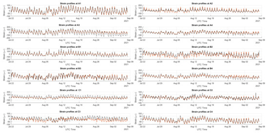 Assuming that , , and are constant in the operational temperature range and all over the D-FOS lines, so is constant over time and space. The transduction coefficient, considering for each parameter the reference values already mentioned, is estimated equal to . This theoretical value has also been estimated empirically by using in Equation (8) the actual strain dataset provided by the VW extensometers. The value that minimizes on the overall strain dataset the square difference between VW strain gauges and the respective D-FOS one is . Hence, the mean value, is considered.